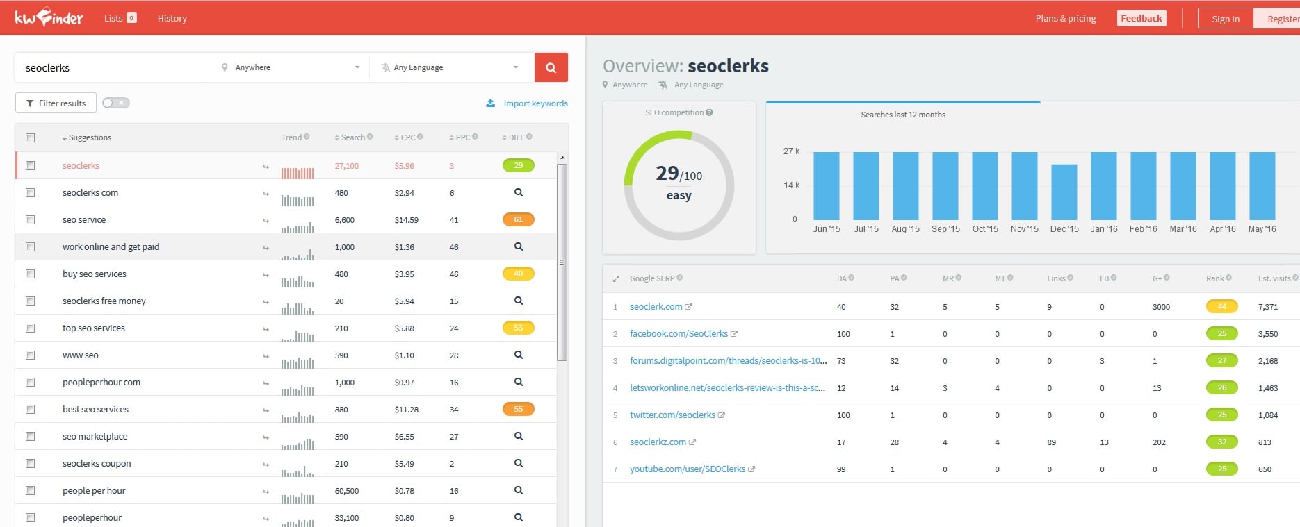 Screenshot of the Kwinder App page for keyword "seoclerks".