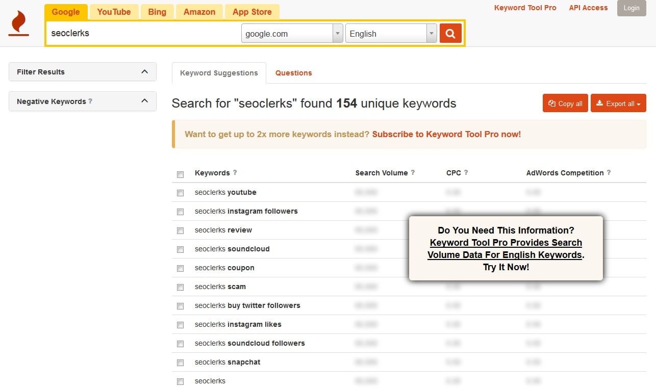 Just their free version gives you many keyword ideas and longtail keyword ideas. You can also choose to see keywords from Google, YouTube, Amazon and the Apple Appstore and choose the country and language of each which is useful for those of you who want to know keywords from different countries and in different languages. They have a pro account that lets you see the search volume, CPC and AdWords competition as well as API access but I've never used this myself and there's no need to if you just want some ideas.