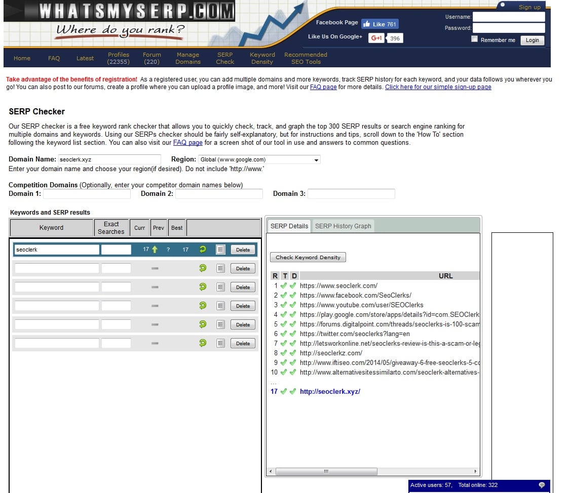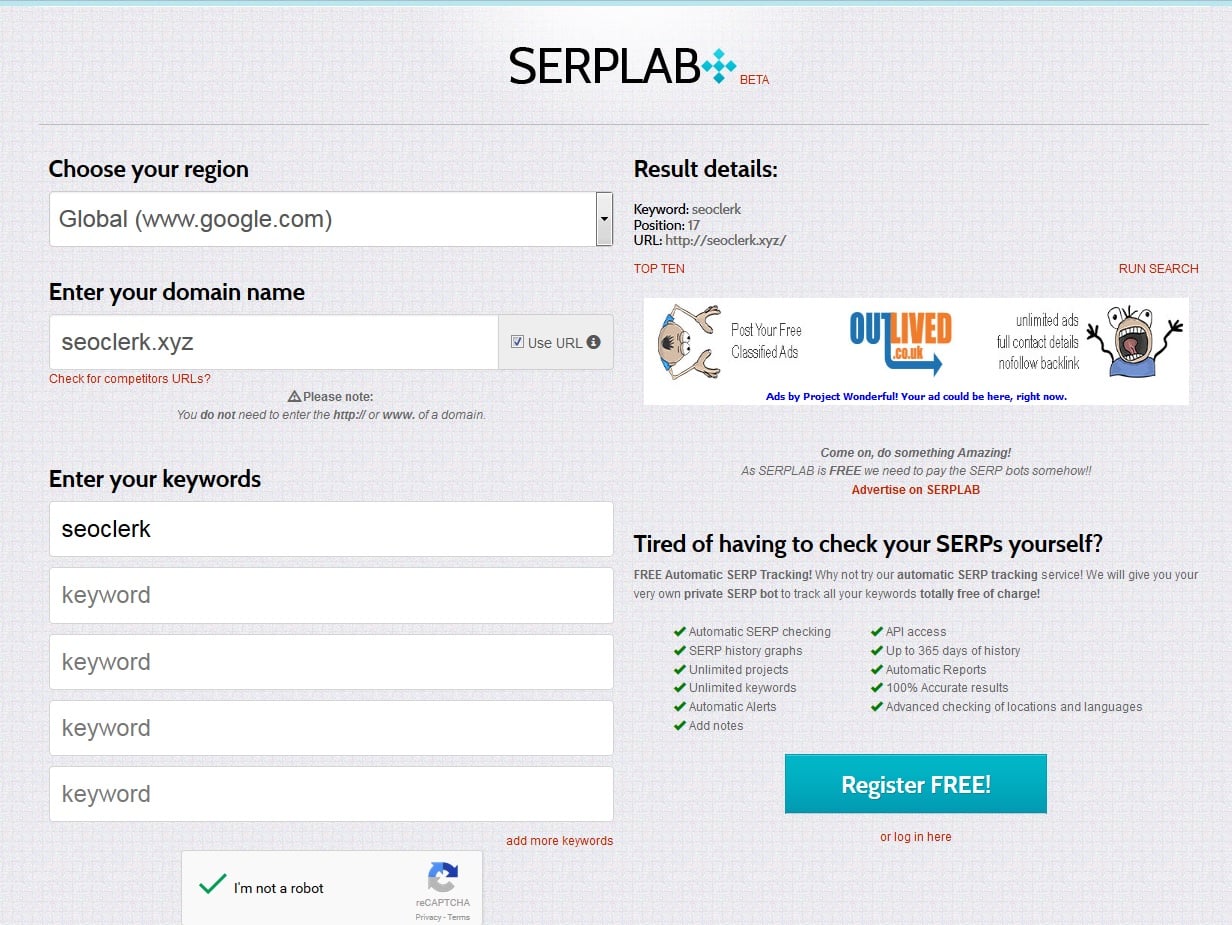 So these are keyword ranking checking tools then. I've not actually come across these before! Will add them to my Tools bookmarks list cheers! I use several other tools similar to these for checking ranking positions that I use all the time. [b]The first one is whatsmyserp.com (http://www.whatsmyserp.com/serpcheck.php)[/b] [url=https://www.seoclerks.com/files/user/images/whatsmyserp.jpg][img]https://www.seoclerks.com/files/user/images/whatsmyserp.jpg[/img][/url] The reason I like to use this one is because you can check on several keywords at the same time. However the only issue is with the domain name field. It cuts off long domains like deep URLs so it's not great for checking them but for a single domain or something its excellent. And serplab.co.uk (https://www.serplab.co.uk/serp-check.php) The reason I like SERPLAB SERP checker is because you can use a long URL and you can choose a region to check as well such globally Google.com or say Canada or something too. It's quite useful for that reason if you're doing SEO for a client not in the US etc. [url=https://www.seoclerks.com/files/user/images/serplab.jpg][img]https://www.seoclerks.com/files/user/images/serplab.jpg[/img][/url] There's also a good Rank Tracker Plugin for ScrapeBox. It's a premium plugin but it's very clever and comprehensive. I've not actually used it though so kinda pointless saying lol but it's an alternative worth mentioning maybe. [video]https://www.youtube.com/watch?v=15fzUFKZ7a8[/video]