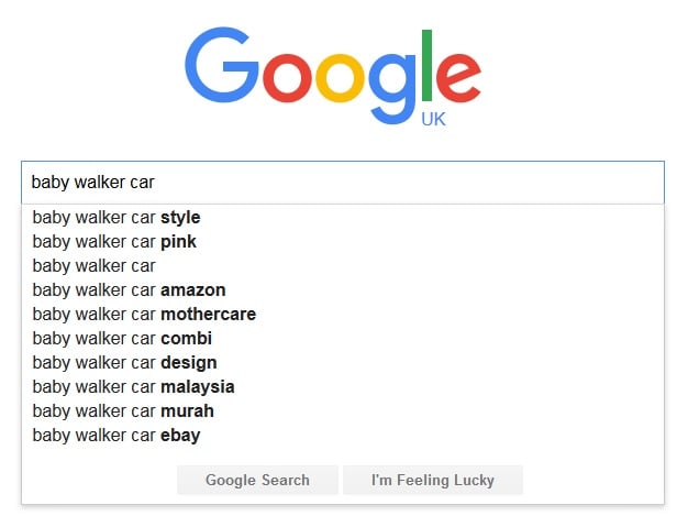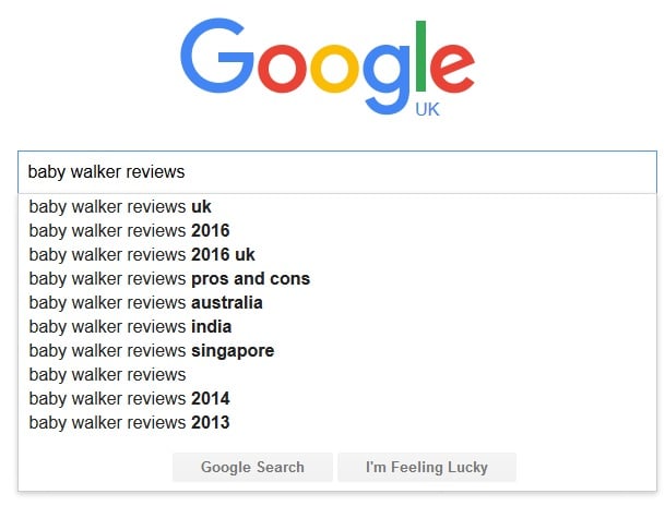 Let's say you're trying to rank for "[b]baby walker[/b]". You can use Google Auto Suggest to get other ideas for other long tails that are most associated with that by just putting that into Google and pressing space, selecting a new word and doing the same again for different long tails of them. Google will always show the most associated and selected phrases to you based on your region.