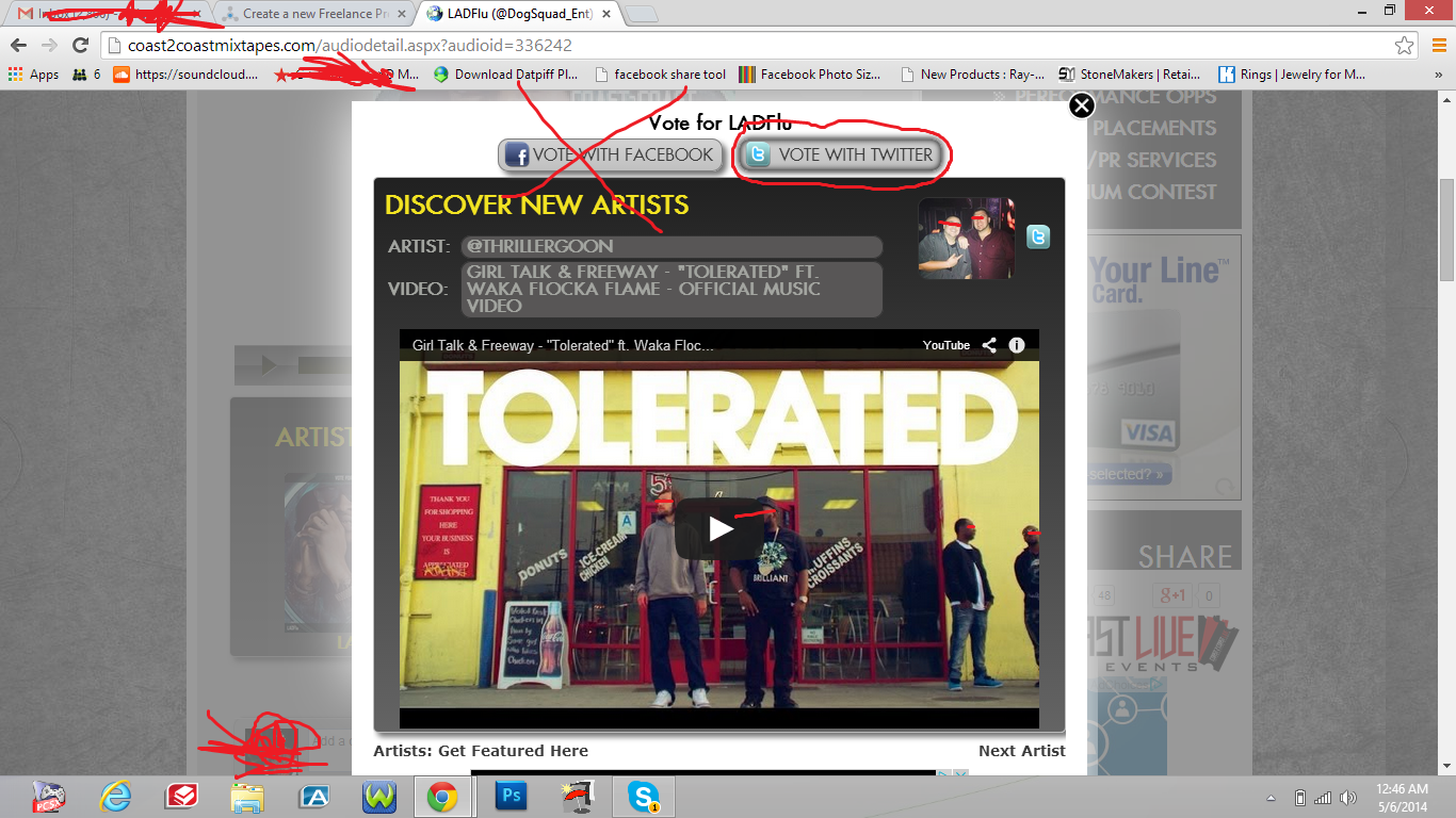 I need 150 "Coast2Coast Mixtape" votes Via Twitter once I give you my link you will have to have twitter accounts authorize coast 2 coast mixtapes to vote successfully. I will include pictures that will demonstrate this process. the only voting method that works is via twitter for some reason it is hard to get votes to work via twitter. This link is not mine but it will look just the same as mine >?http://coast2coastmixtapes.com/audiodetail.aspx?audioid=336242 < inspect the voting method and if you are capable please bid.